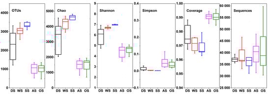 Boxplot of sample: α diversity in seawater and beach sand in Jinshitan bathing beach. DS represents dry sand; WS represents wet sand; SS represents submerged sand; AS represents alongshore seawater; OS represents offshore seawater.