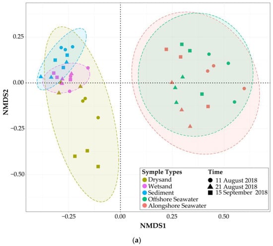 NMDS also showed that the seawater samples’ bacterial community was completely separated from beach sand, even experiencing the typhoon event (Figure 4a). In addition, the bacterial community structure in alongshore and offshore seawater samples was clustered at the OTU level. ANOSIM analysis showed no difference in the bacterial communities at the phylum level between alongshore and offshore seawater samples (p > 0.05). In contrast, there was a significant difference between before and immediately after the typhoon (p < 0.05). Nearly one month after the typhoon, the bacterial community in seawater approached the cluster before the typhoon.