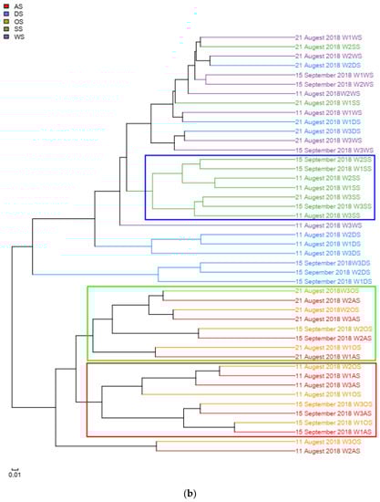 Hcluster_tree was performed to quantify the homologies, which showed that the bacterial community before (11 August 2018) and nearly one month after the typhoon (15 September 2018) clustered in seawater, while most bacterial communities at different stations clustered immediately after the typhoon (21 August 2018), except for W2 station nearly one month after the typhoon (15 September 2018). Most bacterial communities clustered immediately after the typhoon in beach sand (dry, wet, and submerged sand), concordant with the NMDS analysis. Before and one month after the typhoon, the bacterial community in subtidal sediment (SS) clustered, while this trend was not evident in dry sand (DS) and wet sand (WS) (Figure 4b).