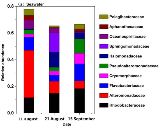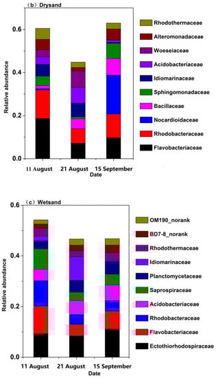 The dominant Sphingomonadaceae of the class Alphaproteobacteria significantly increased in seawater samples but significantly decreased in dry sand samples immediately after the typhoon and recovered nearly one month after the typhoon event (15 September 2018). Rhodobacteraceae, the largest family of Alphaproteobacteria, decreased in dry sand but increased in seawater. Woeseiaceae and Marinobacteraceae from Gammaproteobacteria increased in dry sand and wet sand, respectively. Flavobacteriaceae from the class Bacteroidetes, the largest family of this phylum, significantly decreased in the beach sand (dry and wet sand) and seawater samples immediately after the typhoon. Saprospiraceae (Bacteroidetes) also decreased. Thermoanaerobaculaceae from Acidobacteroita increased in dry and wet sand. All these taxa nearly returned to the former level or showed a recovery trend nearly one month after the typhoon event.