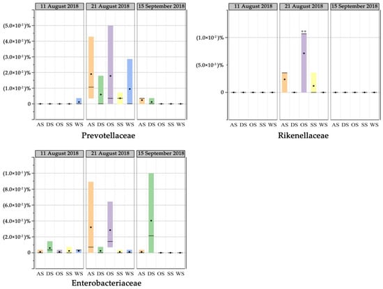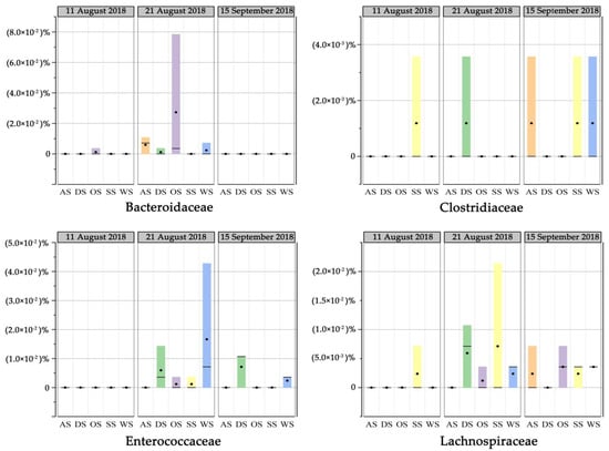 Fecal flora was analyzed to evaluate the impact of the typhoon on the water quality. OTUs classified as Bacteroidaceae, Porphyromonadaceae, Clostridiaceae, Lachnospiraceae, Ruminococceae, Rikenellaceae, or Prevotellaceae [,] were considered as human fecal taxa. OTUs classified as Erysipelotrichaceae, Peptostreptoococcaceae, Enterobacteriaceae, Enterococcaceae [] were considered other fecal taxa (OFT). Total fecal taxa were human plus other fecal taxa.