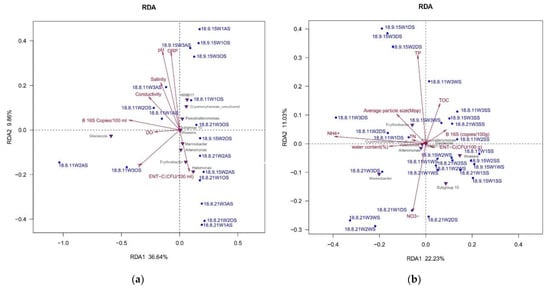 RDA showed the relationship between physical-chemical parameters and the top ten bacterial genera in Jinshitan Bathing Beach. (a) Seawater; (b) beach sand.