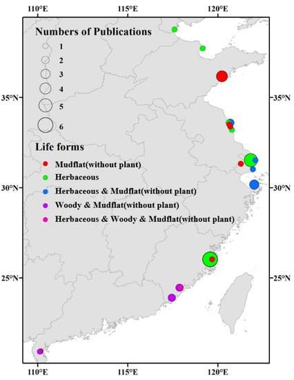 For each study, we extracted the basic characteristics of each study, including publication year, journal, location, temperature, precipitation, type of invasive species, the biomass of invasive plants and native plants, and soil properties (Table S1). The study sites were marked on a map and were mostly located on the eastern coast of China (Figure 1). Following the above criteria, 1339 observations of sulfur-related variables were extracted from 38 publications. The variables we chose were related to plant biomass and soil physicochemical properties, including aboveground and underground biomass, soil pH, electrical conductivity, bulk density, salinity, water content, total carbon, soil organic carbon, soil microbial biomass carbon, organic matter, total nitrogen, ammonium (NH4+), nitrate (NO3−), carbon–nitrogen ratio (C/N), total phosphorus, total sulfur, available sulfur, SO42−, S2−, H2O-S, adsorbed-S, HCl-soluble-S, and HCl-volatile-S. For each variable included, means, standard deviations/standard errors/confidence intervals, and sample sizes (n) were extracted from native communities and the communities invaded by S. alterniflora. If the sample size was lacking, it was defined as 3. Each observation was regrouped for subgroup meta-analysis according to the differences in season species, invasion stages, soil depths, and life forms of the native species. The invasion stages were divided into an earlier stage (invaded for 0–5 years) and a later stage (invaded for more than 5 years). The soil depths were divided into three groups: 0–20 cm, 20–50 cm, and 50–100 cm. The life forms of native species were grouped into herbaceous and woody communities, and mudflats without vegetation served as a control. Part of the data was directly obtained from the article. When the data were presented in a bar chart or line chart, GetData Graph Digitizer (http://www.getda ta-graph-digitizer.com/ (accessed on 2 March 2020)) was used to extract the data in the graphic.