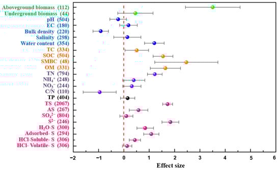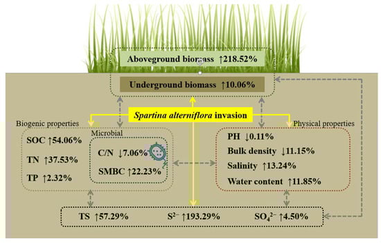 The results showed that the invasion of S. alterniflora stimulated the contents of soil sulfur, including total sulfur, S2−, and SO42−, by 57.29%, 193.29%, and 4.50%, respectively (Figure 6). All results of the meta-analysis support the conceptual framework (Figure 6), which might be an illustration of the pivotal role of sulfur in the success of S. alterniflora invasion. After the invasion of S. alterniflora, the distinct increase in aboveground biomass and underground biomass (Figure 2) led to direct enhancement in net primary production and decomposition of litters [].
