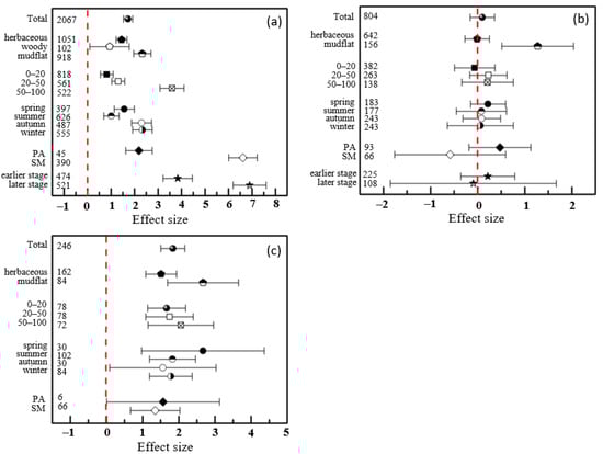 We chose random-effect models to analyze our data, as the data we collected were from field sampling, which might be largely heterogeneous []. A negative effect size indicates a negative effect on the native community after S. alterniflora invasion, while a positive effect size indicates a positive impact. Hedges’ g and a 95% confidence interval (CI) were used to present the effect of each factor.