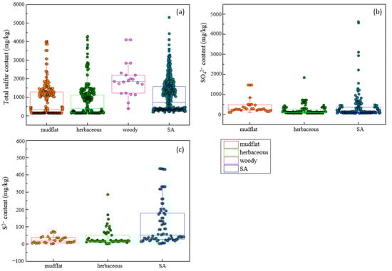 Compared with soil total sulfur content, sulfate and sulfide content responded differently in four seasons to the invasion of S. alterniflora (Figure 3). It is worth mentioning that the effects on soil total sulfur after S. alterniflora invasion in autumn (SMD: 2.30) and winter (SMD: 2.34) were more significant than those in spring (SMD: 1.56) and summer (SMD: 1.02) (Figure 3a), while the effect sizes of sulfate and sulfide in spring were greater than those in the other three seasons (Figure 3b,c). To observe the changes more intuitively and visually in soil sulfur content after S. alterniflora invasion, three scatter diagrams and box charts are shown in Figure 4. The content of soil total sulfur with S. alterniflora was generally higher than that in mudflats and herbaceous communities except in woody communities (Figure 4a). We chose not to show scatter plots or box charts of the soil sulfide and sulfate contents in the woody communities due to a lack of data in mangrove communities in previous literature.