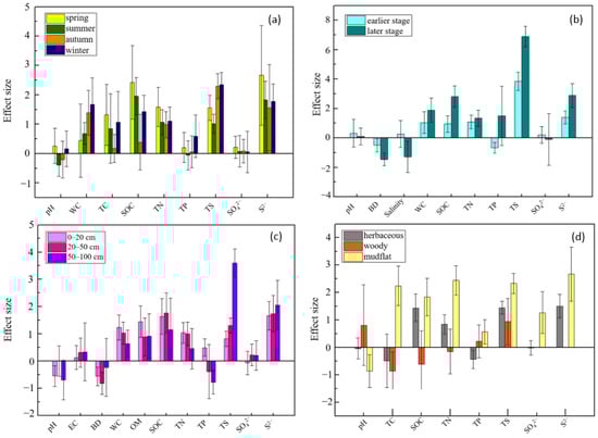 The results of the subgroup analysis of soil properties showed that the range of changes after S. alterniflora invasion also varied among seasons, invasion stages, soil depths, and life forms of native species (Figure 5). In the four seasons, soil organic carbon and total nitrogen increased, and the highest effect size appeared in spring, while the lowest was in autumn (Figure 5a). In all subgroups of soil depths, the invasion of S. alterniflora enhanced soil organic carbon and total nitrogen contents more in 0–50 cm soil layer than in the 50–100 cm layer (Figure 5c). After S. alterniflora invasion, soil organic carbon and total nitrogen increased in the herbaceous communities and mudflats but decreased in the woody communities (Figure 5d). The contents of soil total phosphorus in the herbaceous communities decreased after S. alterniflora invasion (SMD: −0.43), but that in the woody communities increased (SMD: 0.22) compared with an SMD of 0.57 in mudflat (Figure 5d). In addition, soil total phosphorus contents in the earlier stage of S. alterniflora invasion decreased (SMD: −0.66), while it increased in the later stage (SMD: 1.50) (Figure 5b).