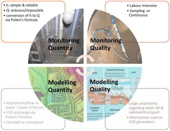 Potential ways to quantify CSO emissions as a circle with four quadrants with monitoring aspects on top, modeling aspects at the bottom, quantitative features on the left, and qualitative features on the right.