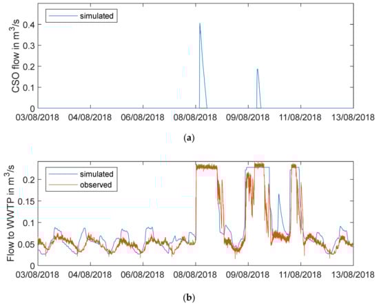 Example of simulated CSO spill flows time series (a) and verification of modeled sewer system outflow with registered WWTP inflow (b).