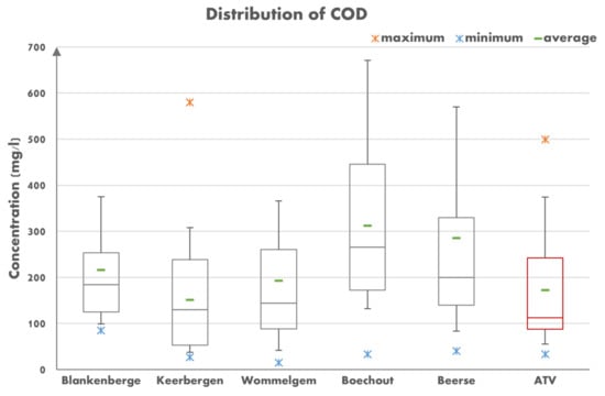 Statistical spread of COD concentrations (1400+ samples) in 5 Flemish catchments + DWA (formerly called ATV) [42].