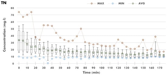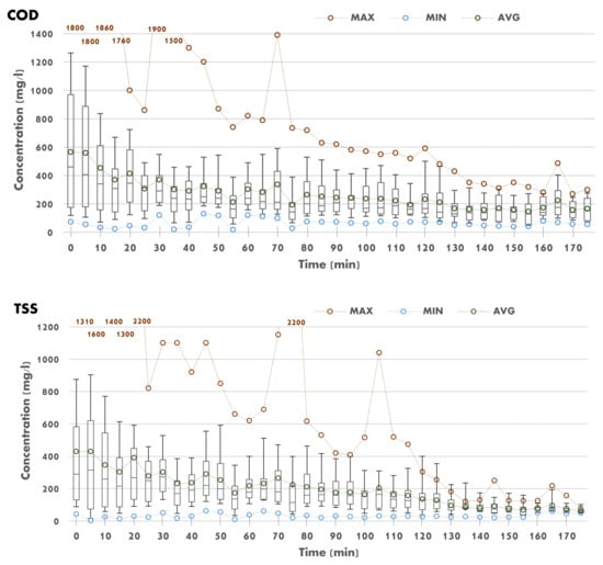 These recorded time-proportional samples can now be combined, regardless of the location and the event, and plotted on an axis according to the time the sample was taken (starting from zero, i.e., the start of the overflow, as the first timestamp). The plots in Figure 4 represent the statistically processed information for COD, TSS, and TN as examples. The charts are restricted to a duration of 180 min because 3 h was the maximum possible sampling time (in most cases) as a result of the utilized grab sampling devices.