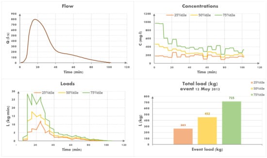 Altogether, these graphs indicate that emissions from CSOs are highly variable over time, showing typically high values accompanied by a widespread at the beginning of the event and slowly decreasing to lower values that remain more or less constant within a narrow bandwidth. It also indicates that calculating CSO emissions with default event mean concentrations (EMCs) [46] could (substantially) underestimate the emitted load for short events (typically less than 1 h) as EMCs will typically be smaller than the initial first flush values found in Figure 4 and Figure 7.