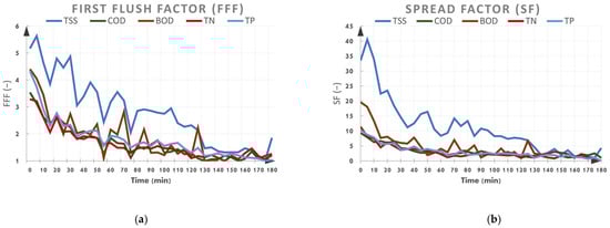 All the other pollutants clearly reveal FFF values starting at values 3 to 4 and slowly dampening to 1.5 after 90 min. TN, TP, and COD, on the other hand, have lower SF values compared to BOD.