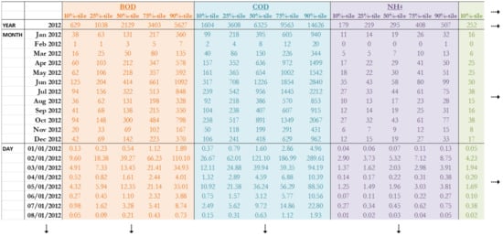 As shown in Figure 8 and Figure 9, the Cockle methodology allows producing statistical output on different aggregation levels such as minutes (not shown but incorporated in the .csv output of the software), days, months, and years. In this way, expected uncertainty ranges are automatically covered, contrary to the use of only a single (usually an average) pre-determined concentration value, which involves a high level of uncertainty [47]. Especially when combined with lumped parsimonious catchments models such as the earlier mentioned approaches from Libra or Level 1, the value of the produced load outcome is questionable.