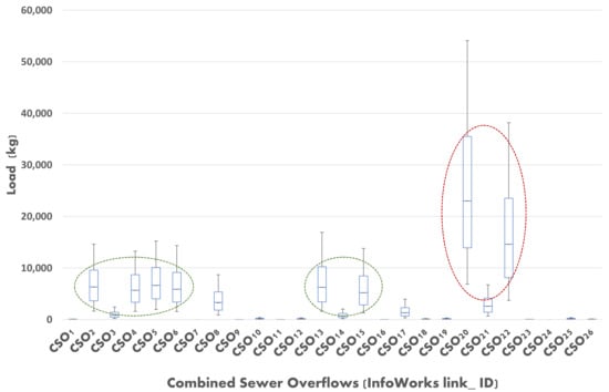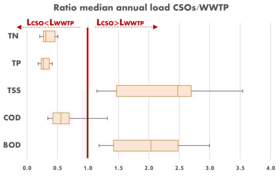 Figure 12 outlines an annual emitted (median) load balance between all CSOs vs. the WWTP of 10 catchments for 5 parameters (TN, TP, TSS, COD, and BOD). These boxplots are composed of the ratio of yearly median emitted CSO load to median emitted WWTP load for these 10 catchments. A value of 1 means that emission from the catchment’s CSOs is equal to that of the WTTP; less than 1 means the WWTP emits more than the CSOs, and greater than 1 means the CSOs emit more.