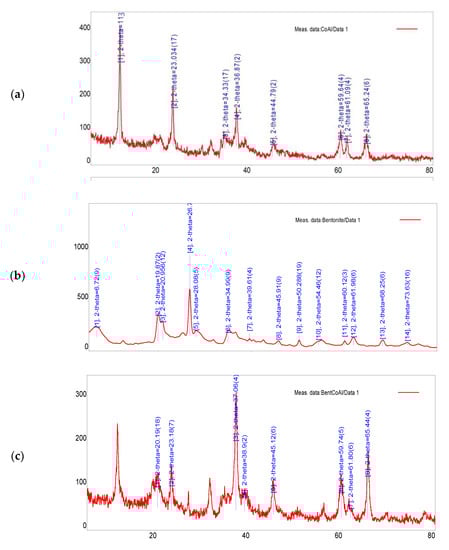 - Elkhider, K.H.A.; Ihsanullah, I.; Zubair, M.; Manzar, M.S.; Mu’azu, N.D.; Al-Harthi, M.A. Synthesis, Characterization and Dye Adsorption Performance of Strontium Ferrite decorated Bentonite-CoNiAl Magnetic Composite. Arab. J. Sci. Eng. 2020, 45, 7397–7408. [Google Scholar] [CrossRef]