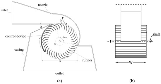 Cross-flow turbine: (a) Section view on symmetry plan of the turbine; (b) Side view. D and W are diameter and width of the runner, V the runner velocity at the inlet surface, ω the runner rotational velocity, α is the velocity inlet angle with respect to the tangent direction and λmax the central angle of the inlet surface.