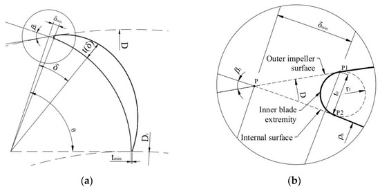 (a) Blade profile; (b) Tangent condition of external end [14]. D and Di are the outer and inner diameter of the runner, β1 is the relative velocity inlet angle with respect to the tangent direction in P, rb and θ are the radius and the central angle of internal surface of the blade, respectively, t is the thickness along the radial direction, orthogonal to the internal surface and δ is the angle between the radial directions at the given point and the intersection of the internal blade surface with the runner inlet. t0 is the thickness corresponding at δmin, rf the radius of the fillet of the tip of the blade, the tip of the blade is tangent in point P1 to the cubic spline profile of the external surface, and in P2 to the circular profile of the internal surface, and tmin is the thickness located at the extremity (δ = θ).