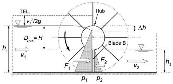 Functional scheme of the HPM, where: T.E.L. is total energy level [m]; h1 is the water depth of the upstream channel [m]; h2 is the water depth of the downstream channel [m]; H is the head difference [m]; v1 is the water upstream velocity [m s−1]; v2 is the water downstream velocity [m s−1]; F1 is the force acting on the blade per unit width [N m−1]; F2 is the reaction force on the blade per unit width [N m−1] [17].