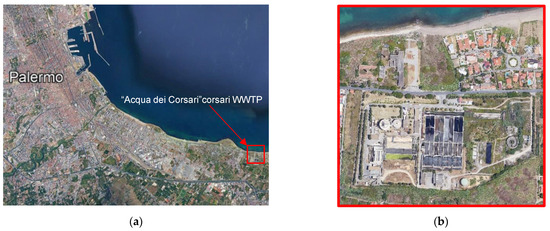 The AMAP S.p.A. is responsible for the integrated water service in 35 municipalities of the Metropolitan City of Palermo. The integrated water service also includes the transport of wastewater, its treatment and disposal. The wastewater treatment plant, named “Acqua dei Corsari”, covers an area of approximately 110,000 m2 and is located at the southeast end of the city of Palermo (Figure 4), at an average altitude of 10 m above sea level.