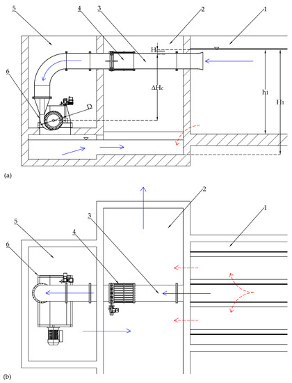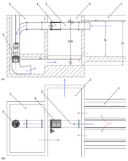 (a) Section and (b) planimetric view of cross-flow-type turbine plant, where: 1. Inlet channel; 2. Discharge channel; 3. Suction pipe; 4. Butterfly valve; 5. Underground room; 6. Cross-flow turbine. The actual jump is ΔHc = 2.8 m; h1 = 3.5 m is the level of the inlet channel; H1 = 4.3 m is the level of the inlet channel (with respect to the bed of the discharge channel); Hlosses is head losses estimated about 0.2 m in the suction pipe and in the butterfly valve, respectively marked with 3 and 4; D = 0.84 m is the outer diameter of the runner.
