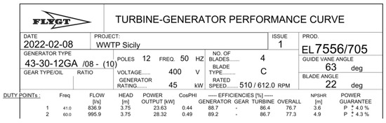 In the technical data sheet of the model (Figure 7), it is observed that the turbine attains the best efficiency equal to 86.7% for a flow rate Q = 0.996 m3/s and a head drop ΔH = 3.75 m. In the range of flow rates of the WWTP (0.8–1.0 m3/s), the efficiency reduction is lower than 1%.