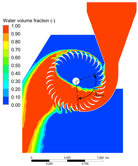 Water volume fraction contours for cross-flow-type turbine (λmax = 100°).