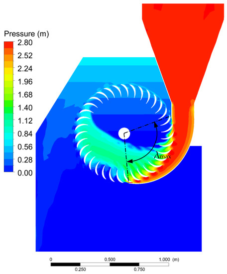 The circular section of the pipe is connected to the rectangular inlet section of the nozzle of the turbine through a special convergent. Numerical analysis has been carried out for validation by computing the efficiency and the flow rate of the turbine for a given head drop ΔHc. The turbine shows an efficiency equal to 83.5%, with a computed discharge close to design data (Q = 0.820 m3 s−1; ΔHc = 2.8 m; ω = 75 rpm; α = 15°; λmax = 100°; D = 0.84 m; W = 0.7 m). In Figure 9, Figure 10 and Figure 11, the computed volume fraction, pressure and velocity fields are shown.