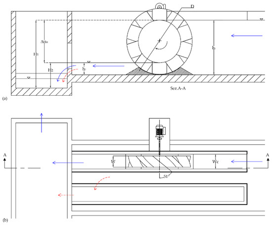 The use of the HPM turbine requires a downstream water depth greater than zero, with a water level H2 equal to the level of the inlet channel bed plus a water depth h2 = 0.75 m (Figure 12). According to the previous section, the diameter of the hub DHub is equal to ΔHH = 2.75 m, the height of the blades is equal to h2 and the outer diameter D is equal to 4.25 m. For this diameter and mass flow rate, the efficiency is given by Equation (15), which attains a maximum value ηhydro = 56% for an upstream velocity v1 equal to 0.3 m/s, corresponding to a width of the wheel W equal to 0.76 m and an angular velocity equal to 7 [rpm]. The HPM turbine is located in one of the two original rectangular weirs of a width Wc equal to 1 m, in order to respect the ratio 1:1.3 between the wheel width and width of the rectangular weir suggested in [16,18]. In case of overflow, the exceeding discharges crosses the other original rectangular weir to directly reach the discharge channel (red dashed arrows in Figure 12).