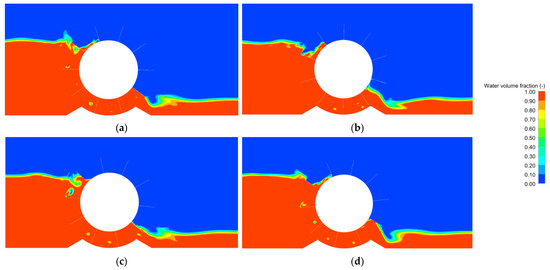 Water volume fraction contours for HPM: (a) t = 18 s; (b) t = 21 s; (c) t = 23 s; (d) t = 25 s.