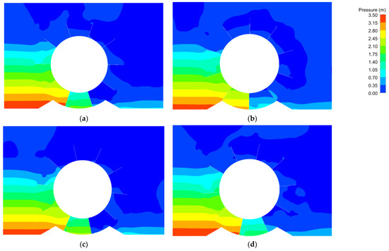 The actual orientation of each blade plane is not parallel to the rotor axis, as assumed in the previous section, but its intersection with the orthogonal plane, including the rotor axis, forms an angle of 51° with the same axis. This has been done to speed up the exit of the water from the volume confined by two sequential blades immediately after the first one attains the vertical position below the rotor axis. Numerical analysis was carried out for validation by computing the efficiency and the flow rate of the HPM for fixed h1 and h2 normal depths. The turbine shows an efficiency equal to 54.5%, with a computed discharge close to the design data (Q = 0.860 m3/s). In Figure 13 the distributions of the water volume fraction for four different simulation times t, and in Figure 14, the distributions of the pressure for four different simulation times t are shown.
