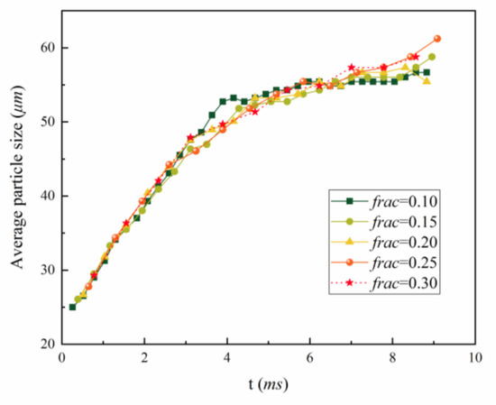 It can be seen from Figure 4 that the simulated results with different time fraction parameters were close during the initial stage, while the calculated average particle sizes with time fraction values of 0.25 and 0.30 increased faster than that with the time fraction of 0.10, and there was the tendency for continuous growth. For visualization purposes, Table 3 shows the relative errors of the calculated average particle size with different time fraction parameters at 7.79 ms.