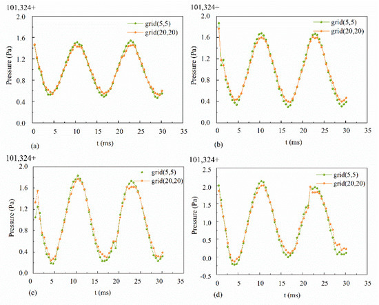 In Figure 5, two fluid grids that are far from each other are selected in the box, and are the grids of the 5th row, the 5th column, and the 20th row and the 20th column, which are represented as grid (5, 5) and grid (20, 20), respectively. The pressure changes in the two grids under different conditions were calculated, as shown in Figure 5. The results verified that the pressure of the fluid domain fluctuated during the box vibration, which was equivalent to the action of sound waves.