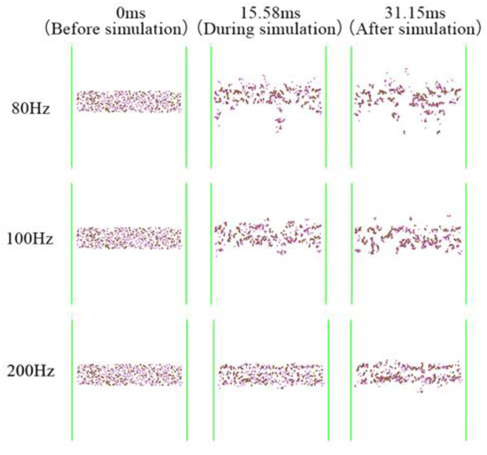 The CFD-DEM numerical model was established to simulate the agglomeration behaviour of the aerosol droplet particles under the action of sound waves. By comparing the images of the particle swarm before the simulation, during the simulation, and after the simulation, it can be clearly seen that the particles agglomerated during the simulation, and multimers were formed, as shown in Figure 6, which visually demonstrates the process of agglomeration of particles under the action of sound waves as well as the frequency effects of acoustic agglomeration.
