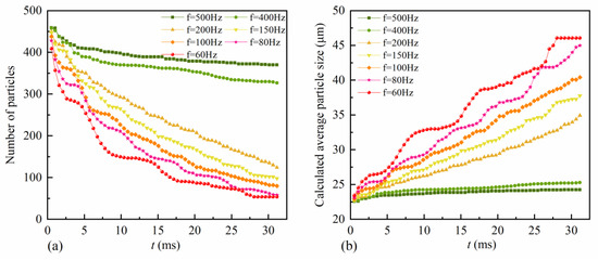 In order to explore the influence of different SPLs on the motion of aerosol droplets, the sound frequency should be kept constant. The sound wave frequency covered a wide range, and a specific frequency needed to be selected during the simulation. Previous studies proved that low frequencies had a more significant effect on particle agglomeration [29]. In this study, two low frequencies of 60 Hz and 80 Hz were selected for the simulation. Figure 10 shows the number of particles and the calculated average particle sizes during the simulation.