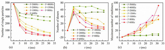 Along with the simulation, the number of single particles decreased gradually under various sound frequencies. With the decrease of the sound frequency, the decreasing speed of the number of single particles increased, and the numbers decreased for all of the sound frequencies at the end of the simulation; the number of dimers first increased and then decreased, and it was larger at higher frequencies at the end of the simulation. Therefore, it was inferred that the particles do not easily collide and coagulate under higher sound frequency. At lower frequencies, the number of dimers had a maximum, and it began to decrease afterwards, owing to the participation in the coagulation of larger multimers. Generally, the probability of forming large multimers was higher with lower sound frequency. However, randomness existed in the simulation, which played an increasingly important role as the number of particles decreased. Therefore, the maximum number of multimers was not entirely negatively related to the sound frequency.