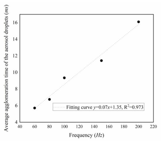 For sound waves with constant SPL, the low-frequency sound wave was found to have a significant effect on the agglomeration of aerosol droplets, which became more and more obvious with the increase of the SPLs. The low-frequency sound waves were also found to be more helpful in the formation of larger multimers, which was consistent with the agglomeration law of fine particles under the action of sound waves reported by Wang [32]. The correlation between the average agglomeration time and frequency showed that they are positively correlated, i.e., low-frequency sound waves promoted the aerosol droplet agglomeration better than high-frequency sound waves. For a constant frequency, the sound wave promotion effect was enhanced as the SPL increased, and the average agglomeration time and the SPL of the sound wave exhibited a negative correlation.