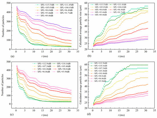 Impact of the SPLs on aerosol droplet particles’ agglomeration: (a) plots of calculated average particle size under sound waves of f = 60 Hz; (b) plots of the number of particles under sound waves of f = 60 Hz; (c) plots of calculated average particle size under sound waves of f = 80 Hz; (d) plots of the number of particles under sound waves of f = 80 Hz.
