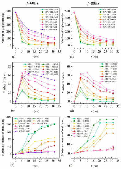 Plots of (a) the number of single particles for 60 Hz sound waves, (b) the number of single particles for 80 Hz sound waves, (c) the number of dimers for 60 Hz sound waves, (d) the number of dimers for 80 Hz sound waves, (e) the maximum number of particles in the multimers for 60 Hz sound waves, and (f) the maximum number of particles in the multimers for 80 Hz sound waves.