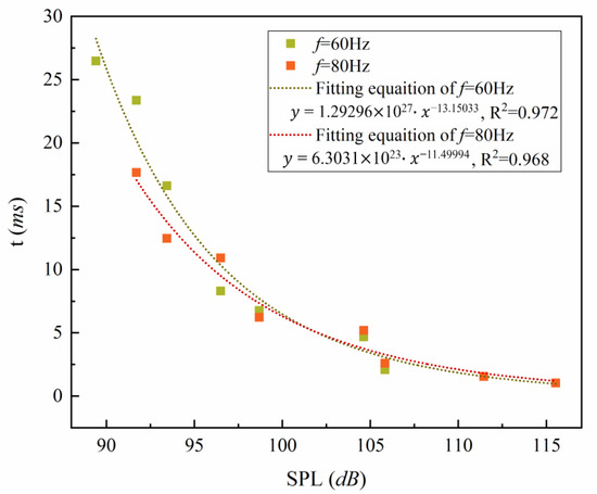 The average agglomeration time was the parameter describing the agglomeration speed. With a constant frequency, the average agglomeration time was shortened with the increase of SPL, indicating faster aggregation. The curves in Figure 12 were fitted by exponential functions with good correlation. It can be inferred that when the SPL was low, corresponding to SPL values of 90~100 dB in this study, it had a greater influence on the agglomeration speed; meanwhile, when the SPL was higher, which corresponded to greater than 110 dB in this study, it had a little effect on the agglomeration speed.