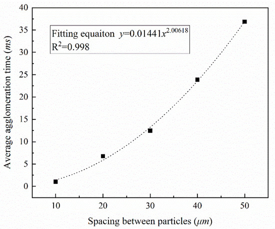 With the increased spacing, the particle agglomeration speed decreased, and the rate of growth of the calculated average particle size decreased. This is because when the spacing between the particles was large, a larger displacement was required for collision and cohesion, and it took a longer time under the same flow field. Figure 14 shows the variation of the average agglomeration time with particle spacing to better compare the effect of particle spacing on aerosol droplet agglomeration intuitively, which can be fitted by a power function with good correlation.