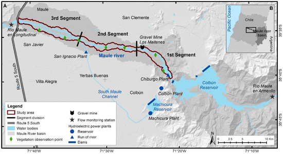 In the period when the plant was built, such projects did not require rigorous environmental assessments and were evaluated mainly based on their benefits. Studies indicate that the effects of dams have become apparent only in recent decades, once they have been in operation for 20 to 30 years [10]. In addition, the quantification of their impacts is complicated, given a large number of variables involved and the different time scales at which they occur [35]. The increase in energy and water demand in Chile suggests that such studies are necessary to understand the cause–effect relationships at local and regional scales and thereby provide better tools for water management. Thus, evaluating channel morphology and land cover changes in a middle section of the Maule River, emphasizing vegetation distribution after the Colbún dam began to operate, is an important topic of study. To complement the remote sensing analysis used to assess and classify land cover changes, a tree and shrub species identification was carried out in the field at in situ observation points to improve classification. The identified land cover changes were analyzed based on the magnitude and frequency of flows, on which data was collected from two available gauging stations located along the main river course. The results will provide new information on the impacts of large reservoirs in south-central Chile fluvial systems.