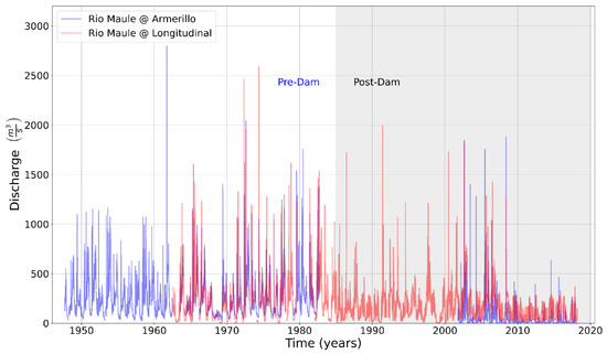 The flow data were obtained from stations managed by the General Water Directorate (DGA-MOP): (i) Rio Maule at Longitudinal, code 07322001; and (ii) Rio Maule at Armerillo, BNA code 07321002. The stations are located downstream and upstream of the study segment, respectively. For the analysis, mean daily flows, recorded as starting in 1962 at Longitudinal and 1947 at Armerillo, were used. The period until 1984 was used to represent unregulated flows (i.e., prior to the dam), and the period between 1985 and 2018 was used to characterize the regulated period (i.e., following the installation of the hydroelectric plant).