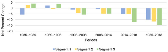 Net percent change by segment. Note: the change percentages are indicated with respect to the beginning of each analyzed year and the last period indicates the overall change for 1989–2018.