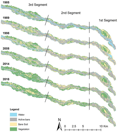 The supervised classification process obtained land cover maps for each analyzed year (Figure 4). An overall view of the initial years (1985–1989) revealed the predominance of bare zones and active bars, which occupied over 50% of the surface area. In second place were vegetation zones, followed by water cover. This last category was the most significant in 1985, possibly associated with the high recorded summer flows (445 m3/s). However, it started to diminish in 1989 and presented lower values even for large summer flows of about 131 m3/s.