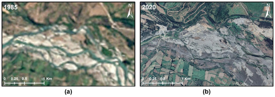 Recorded changes in the channel corresponding in segment 1: (a) December 1985, (b) October 2020. Source: Modified from Landsat resolution 30 m and Google images.