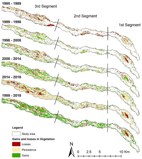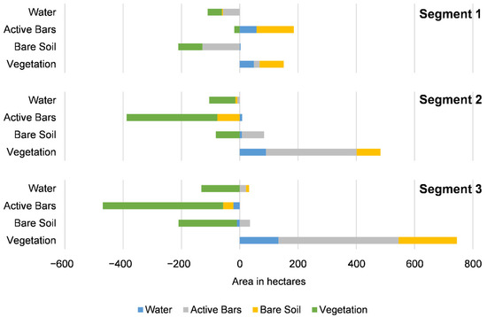 The dynamics of land cover changes between the 1989 and 2018 periods are shown in Figure 6. The bars represent the proportion of hectares that each land cover contributed to the net change of a particular one. It can be observed that more than 55% of the gains in vegetation cover came from active bars, especially in segments 2 and 3, where over 80% of the bar surface area became plant-covered. On the other hand, over 95% of bare soil losses were direct gains for vegetation cover in segments 2 and 3. In segment 1, the dynamic was different; the vegetation cover gains mainly came from bare soils (55%) and water covers (32%), while the active bars accounted for a lower percentage (13%).