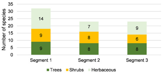Tree and shrub species identification complemented the remote sensing analysis in the channel and riverbank zones. At the seven observation points (Figure 1), it was possible to identify 35 species, 48.6% of which were plants, 25.7% tree species, and 25.7% shrub species. The distribution of the number of shrub and tree species was similar among the three segments (Figure 8); only the number of herbaceous plants was more significant in segment 3. In terms of origin, invasive species predominated (63%), while native species of the Chilean Mediterranean zone accounted for no more than 37%.