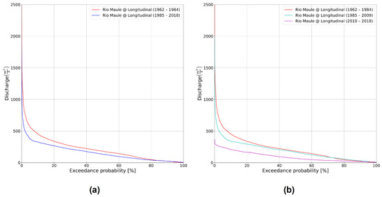 (a) Flow exceedance probability for both periods, (b) Flow exceedance probability, with separation of the regulation period before and after 2010 (i.e., documented beginning of the drought).