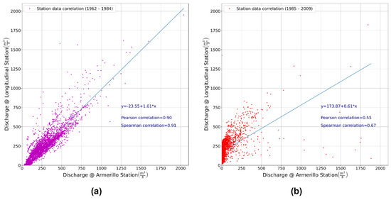 Mean daily flow data correlations between the Armerillo and Longitudinal stations, for (a) the period before and (b) after the dam.
